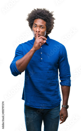 Afro american man over isolated background asking to be quiet with finger on lips. Silence and secret concept.