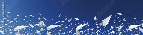 Against a deep blue sky, a flurry of white paper airplanes soar and then gently descend.