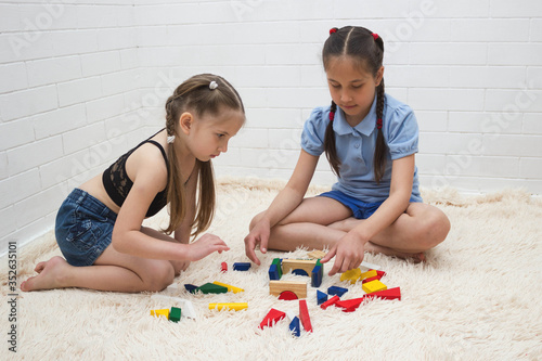 Against a light background, two little girls with dark and blond hair dressed in denim shorts in a T-shirt and top play an educational game in the pyramids on the floor