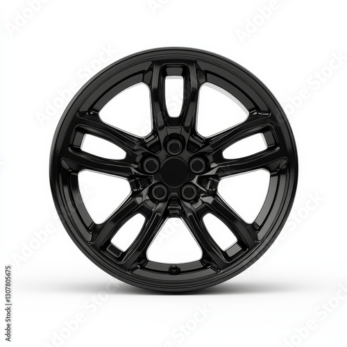 Against a white background, a black alloy wheel rim with a stylish look rotates, perfect for enthusiasts of cars and the automotive industry