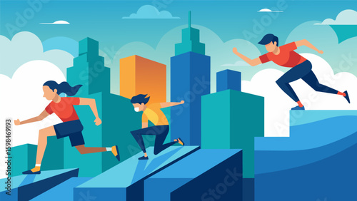 Against the backdrop of a virtual city skyline dedicated parkour trainees push their limits and push themselves towards peak performance through a VR. Vector illustration