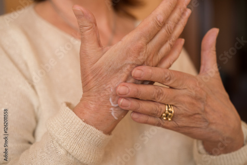 Aged 70s Woman Hands Care Cream Close-up. Elderly Adult Lady Apply Cream on Skin and Massage Arm for Softness. Concept Anti-Aging Nature Cosmetic. Daily Moisturizing Hydration Vitamin Cream.