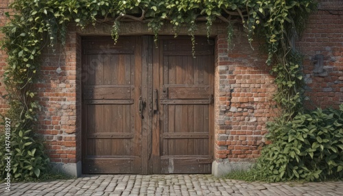 Aged brick wall, antique wooden door, overgrown vines , entrance, red