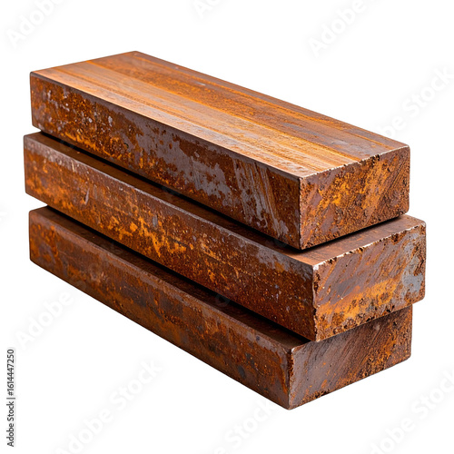 Aged steel beam pieces stacked together, featuring rich oxidation and industrial decay.