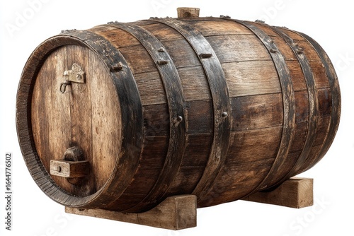 barrel, wooden, aged, oak, vintage, antique, container, storage, fermentation, wine, liqueur, spirit, craft, craftsmanship, wood, dark, brown, rustic, hoard, holding, liquid, round, cylindrical, horizontal, full, metal, band, ring, iron, hardware, hinge, latch, support, leg, isolated, white, background, old, historical, traditional