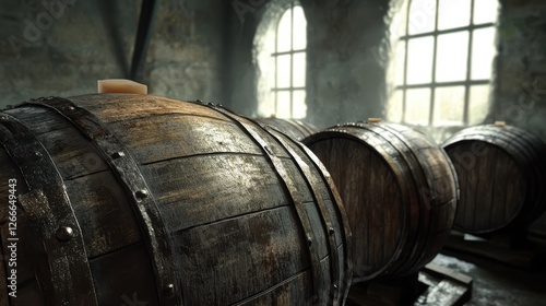 Aged Wooden Barrels in a Stone Cellar