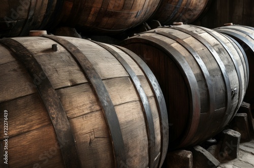 Aged wooden barrels. Original and capacity object with different beverage. Generate AI