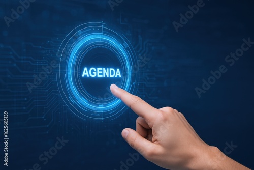 Agenda Interface Concept: Finger Touching a Luminous Button with Digital Elements on a Dark Blue Background