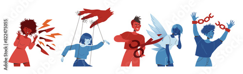 victim, aggressor, suffering, woman, man, illustration, set, bullying, female, male, weak, threatening, character, hurt, violence, shouting, angry, cruel, harassment, finger, string, scissors, chain, wing, stress, problem, violent, abusing, trouble, aggressive, negative, red, blue, despot, emotion, pressure, frighten, tyrant, bad, harmful, person, isolated, art, vector