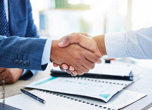 Agreement, businessmen with handshake and with contract in office at workplace. Business meeting or interview, thank you or crm and people partnership or onboarding shaking hands in a boardroom