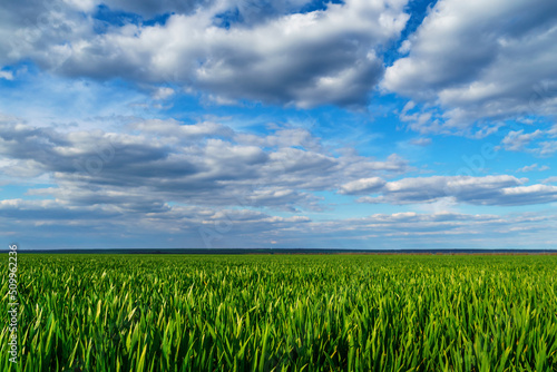 agricultural field with young green wheat sprouts, bright spring landscape on a sunny day, blue sky as background