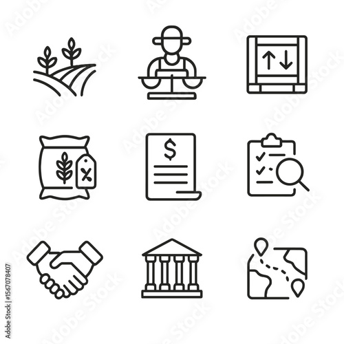 agricultural, trade, icon, outline, icon, set, tariff, crop, field, farmer, with, scale, import, export, crate, percentage, tags, grain, bag, subsidy, form, inspection, clipboard, negotiation, handshake, agrarian