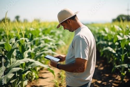 Agriculture using tablet computers inspecting corn crops growing in corn farm