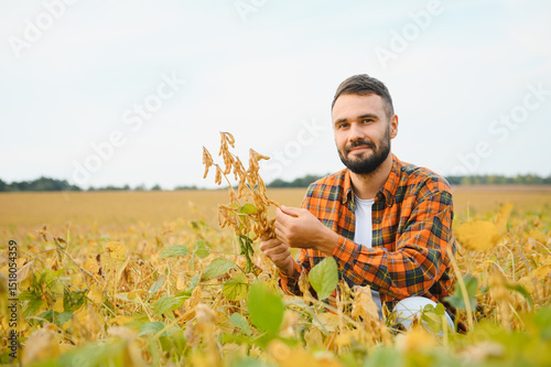 Agronomist inspecting soya bean crops growing in the farm field. Agriculture production concept.