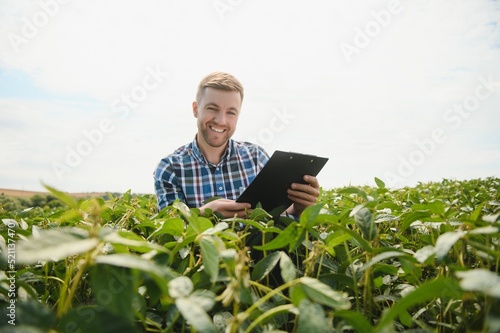 Agronomist inspecting soya bean crops growing in the farm field. Agriculture production concept. young agronomist examines soybean crop on field in summer. Farmer on soybean field.