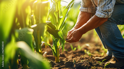 agronomist inspecting soybean plants in a lush field
