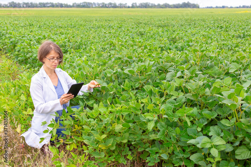 Agronomist with a tablet looks at a soybean plant. The farmer examines the soybean leaves.