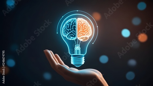 AI and Human Intelligence – A Futuristic Holographic Brain Light Bulb Concept
