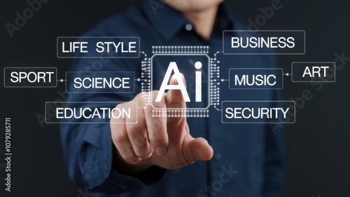 AI Artificial Intelligence. A person interacting with a holographic interface showcasing AI's influence across different sectors such as business, education, sport, science, security, and lifestyle.