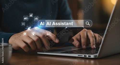 AI Assistant Search Concept: Hands Using Laptop and Phone with AI Icons