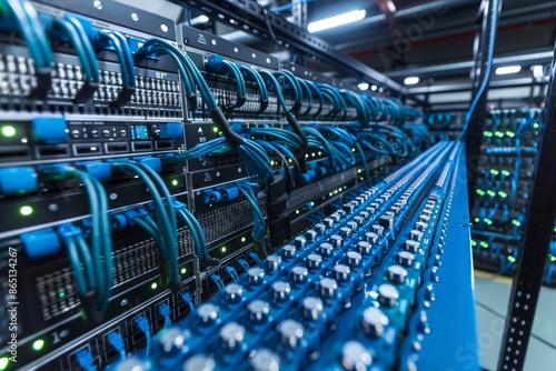 AI Data Center with Servers, High tech Infrastructure, Blue and Purple Light, Futuristic Technology, Advanced Computing, Artificial Intelligence