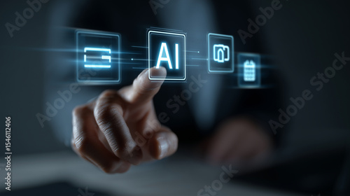 AI fintech concept, floating holographic icons: bank, wallet, credit card, invoice, calendar, glowing lines, businessman's hand interacting, futuristic minimal office, copy space