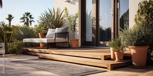 AI Generated. AI Generative. House outdoor nature terrace garden with doormat table chair and plants. Cozy home architecture relax vibe. Graphic Art