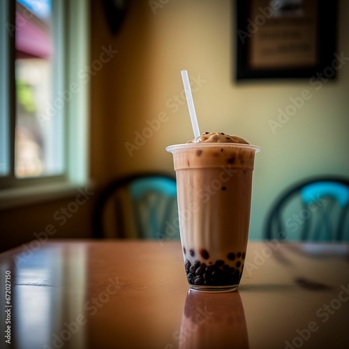 AI generated illustration of a tall glass of iced coffee with a straw at a cozy cafe