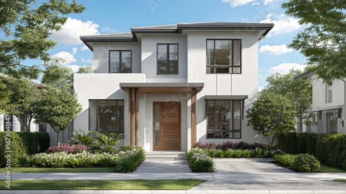Ai generated image of a modern twostory house with a white facade, a wooden door, and large windows, surrounded by greenery and a wellmaintained lawn