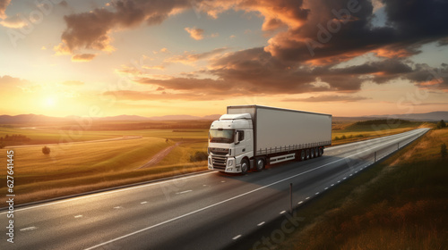 AI generated image of modern large trailer driving down an empty road at sunset. Logistics company. Freight transportation. Fast delivery.