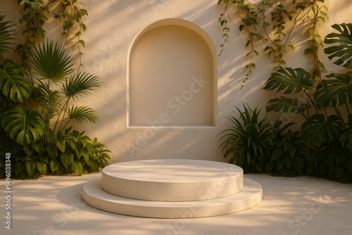 AI Generated image of Two tiered platform surrounded by lush green plants and a textured wall with an arched niche, bathed in soft, warm light creating a serene botanical scene