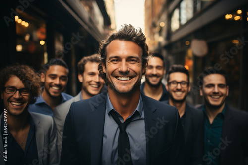 Ai Generative group of happy business man and business women, dressed in suits are smiling, in the office