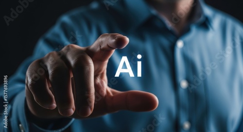 AI Innovation: A close-up shot of a hand interacting with a glowing "AI" symbol, representing the futuristic world of artificial intelligence and technological advancement.