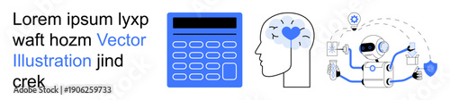 AI innovation, cybersecurity, healthcare, education, technology, automation. Features a calculator, a head with a heart and a robot. AI innovation and cybersecurity