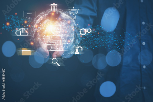 AI is innovation smart robot assistant support big data. Science, technology concept. Businessman touching virtual screen of Artificial intelligence AI circuit board with chatbot in virtual the world.