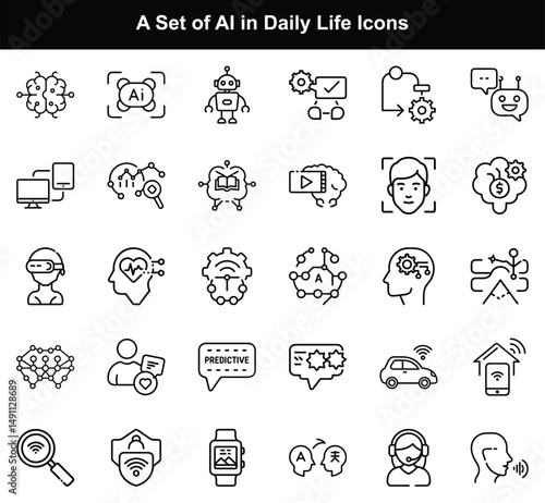 AI Technology Icons Set, Thin Line Style, Brain, Robot, Automation, Smart Home, on Transparent
