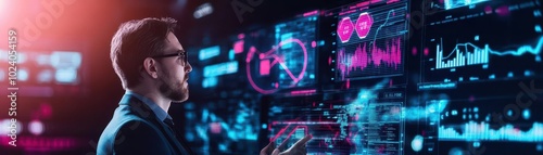 AIpowered business analyst interacting with holographic screens, showing market insights and financial projections, neon accents, dark background