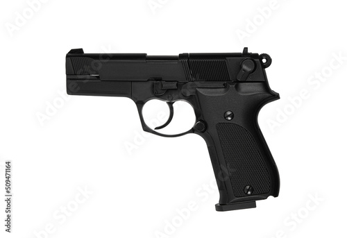 Air gun. Modern pneumatic weapon for air soft, sports and entertainment. A dummy, a copy of a real pistol. Isolate on a white back