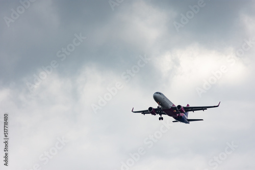 Airliner in the air taking off on a bad weather or preparing to land on a day with storm clouds with landing gears out.