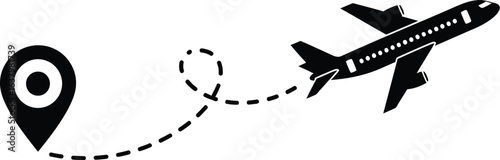 aeroplane, silhouette, travel, flight, aviation, transportation, journey, destination, location, pin, map, navigation, route, path, dotted, line, air, vacation, holiday, trip, global, adventure, wanderlust, icon, symbol, graphic, vector, illustration, black, and
