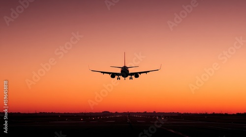 Airplane Flying Toward Sunset Sky Du Arrival or Departure at Airport with Vibrant Orange and Pink Colors