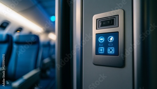 aeroplane, panel, control, buttons, illuminated, flight, aviation, travel, technology, modern, interior, cabin, aircraft, electric, power, light, blue, dark, metal, switch, electronic, device, system, design, interface, contraption, innovation, future, airliner, jet, seat, passenger, comfortable, luxury, elegant, premium, atmosphere, ambient, inflight, service