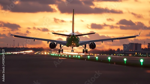 aeroplane, landing, sunset, runway, aerodrome, flight, travel, passenger, jet, aircraft, dusk, horizon, cloud, sky, transport, tour tourism, traveler, destination, flying, journey, speed, beautiful, dark, light, evening, plane, taxiway, guidance, navigation, safety, control, airliner, commercial, engine, wing, ground, approach