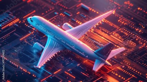 aeroplane, aircraft, circuit, board, technology, digital, electronic, futuristic, innovation, connection, travel, flight, electronic, future, engineering, chips, hardware, microchip, wire, network, wiring, communication, aviation, airliner, sky, flying, transportation, air, journey, global, passenger, engine, wing, tail, fuselage, blue, red, glow