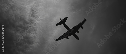 aeroplane, flight, cloud, sky, silhouette, monochrome, greyscale, travel, aviation, transportation, aircraft, overhead, cloudscape, grey, texture, air travel, journey, flying, vehicle, wing, dark, light, shadow, photo, image, background, design, illustration, vector, isolated, copy space, element, graphic, transport, airliner, jet