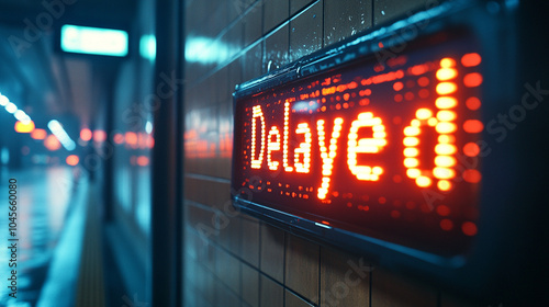 airport departure board displays the word "Delayed," symbolizing the frustration and anticipation of travelers waiting for their flights amidst busy airport activity