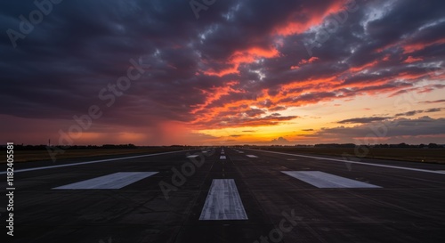 airport runway at sunset, dramatic red and orange sky, stormy clouds, silhouette landscape, long exposure, wide angle shot, cinematic lighting, high contrast, moody atmosphere, aviation theme, panoram