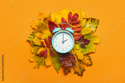 Alarm clock and autumn leaves on color background. Daylight saving time end