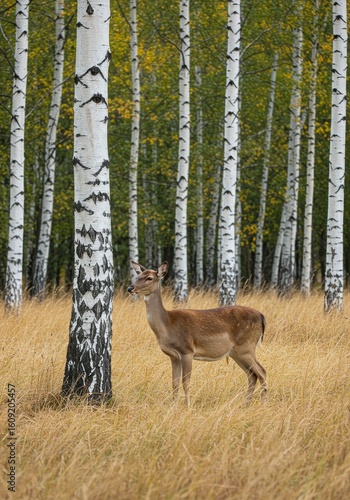 cervid, roe, birch, forest, autumn, wildlife, animal, nature, tree, elegant, graceful, serene, peaceful, tranquil, calm, stillness, quiet, natural, gold, brown, white, yellow, timberland, mammal, ungulate, herbivore, outdoors, landscape, scenic, rural, habitat, environment, conservation, wild, alert, vigilant, season, fall, temperate, flora, fauna, beauty, wilderness, observation, pasture, meadow