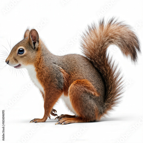 Alert Squirrel in a Natural Setting: A charming squirrel stands in full profile, its alert gaze and fluffy tail capturing the essence of forest life, in a simple, clean, photorealistic style.